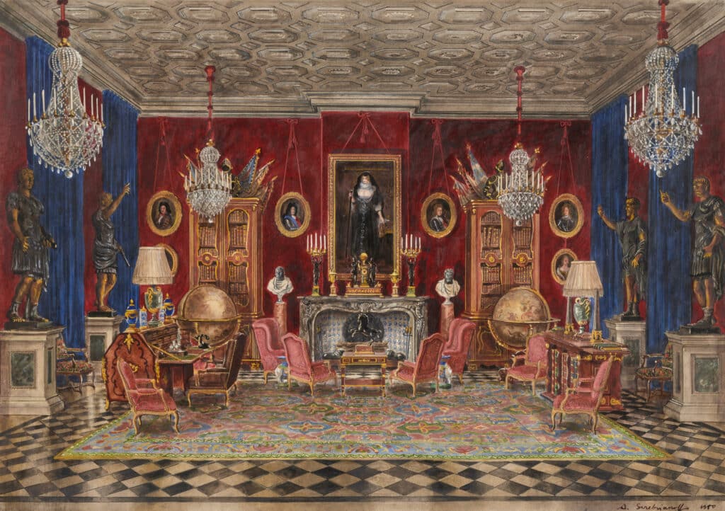 La vue de la bibliothèque de l’ambassade de Grande-Bretagne, non signée, révèle de manière magistrale par une gouache très aboutie le travail de Charles de Beistegui pour l’ambassadeur Duff Cooper, en poste à Paris de 1944 à 1947, et qui renouvela en partie le décor de l’hôtel de Charost, sur les conseils de Daisy Fellows. La fille du duc Decazes, épouse en secondes noces d’un cousin de Winston Churchill, était alors au centre de la vie de la haute société européenne, la fameuse Café Society, et une amie de l’ambassadeur Cooper. Et c’est pour cette société riche et raffinée qu’Alexandre Sérébriakoff réalisera l’essentiel de son œuvre, immortalisant les intérieurs les plus élégants.
