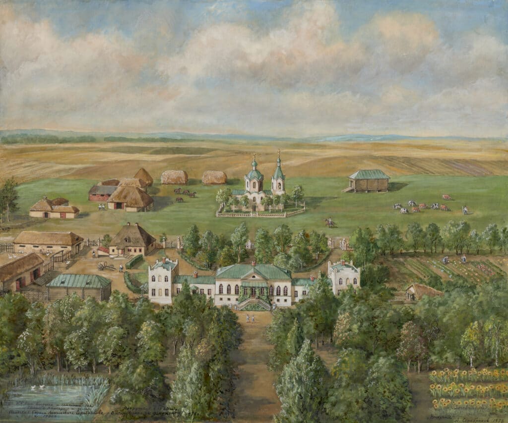 « В XIX веке владение и семейный дом Евгения А. Лансере и за ним поместие Бориса Анатольевича Серебрякова с 1900 г. Разрушено в 1920 году. Востановлено по документу 1978 г.» [« Au XIX siècle propriété et maison familiale d’Eugène A. Lanceray, et à côté, la maison de Boris Anatolievitch Sérébriakoff de 1900. Détruit en 1920. Fait de mémoire d’après un document. 1978. »]