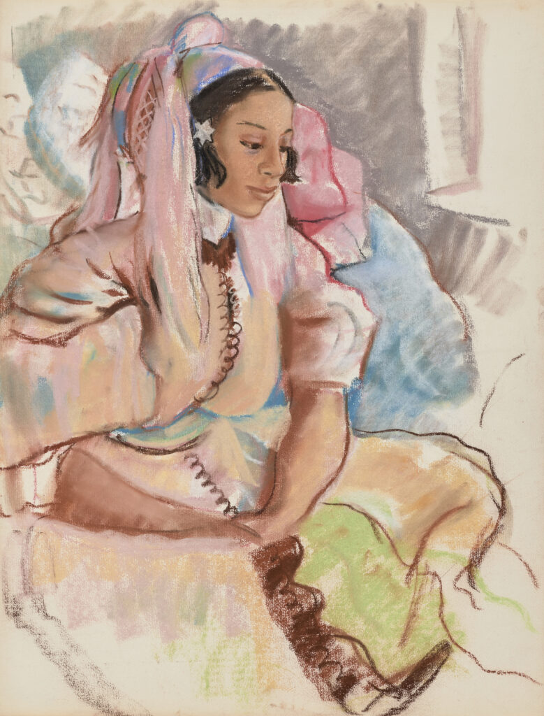 Esquisse au pastel : Femme torse nu assise en tailleur
