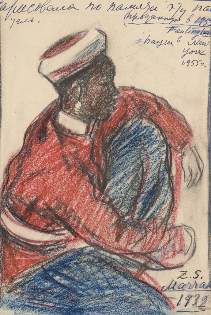 – Inscription en russe à l’encre bleue, postérieure « Нарисовала по памяти эту пастель (проданную в 1953 в New York 1955 » [« J’ai fait de mémoire ce pastel (vendu en 1953 à New-York 1955 »] : recto, partie supérieure